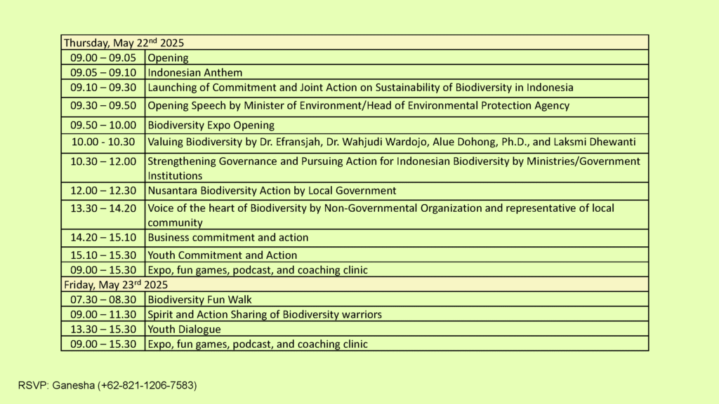 Some of the highlights of the event is the Launch of the Indonesia’s Biodiversity Strategy and Action Plan (IBSAP) 2025–2045, Countdown to Impact: Launching the 7th National CBD Report (KMGBF Aligned), and Launch of the Revitalization of the Indonesian Biodiversity Clearing House and also Launch of BRAVE: Collective Actions Toward Youth Biodiversity Conference 2026. Panel discussions on biodiversity governance, youth-led dialogues, and an expo showcasing innovations in biodiversity conservation are also some of the included key activities.